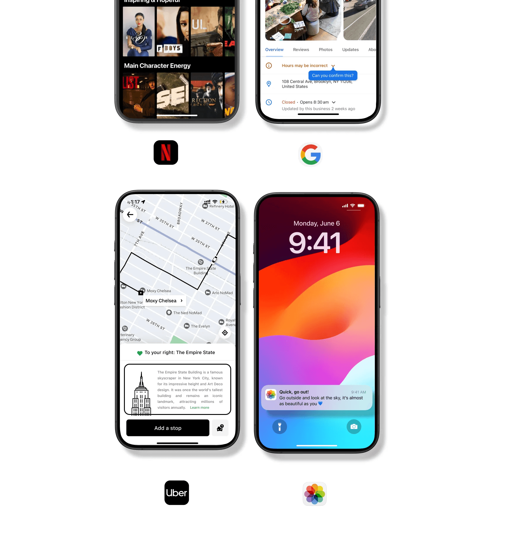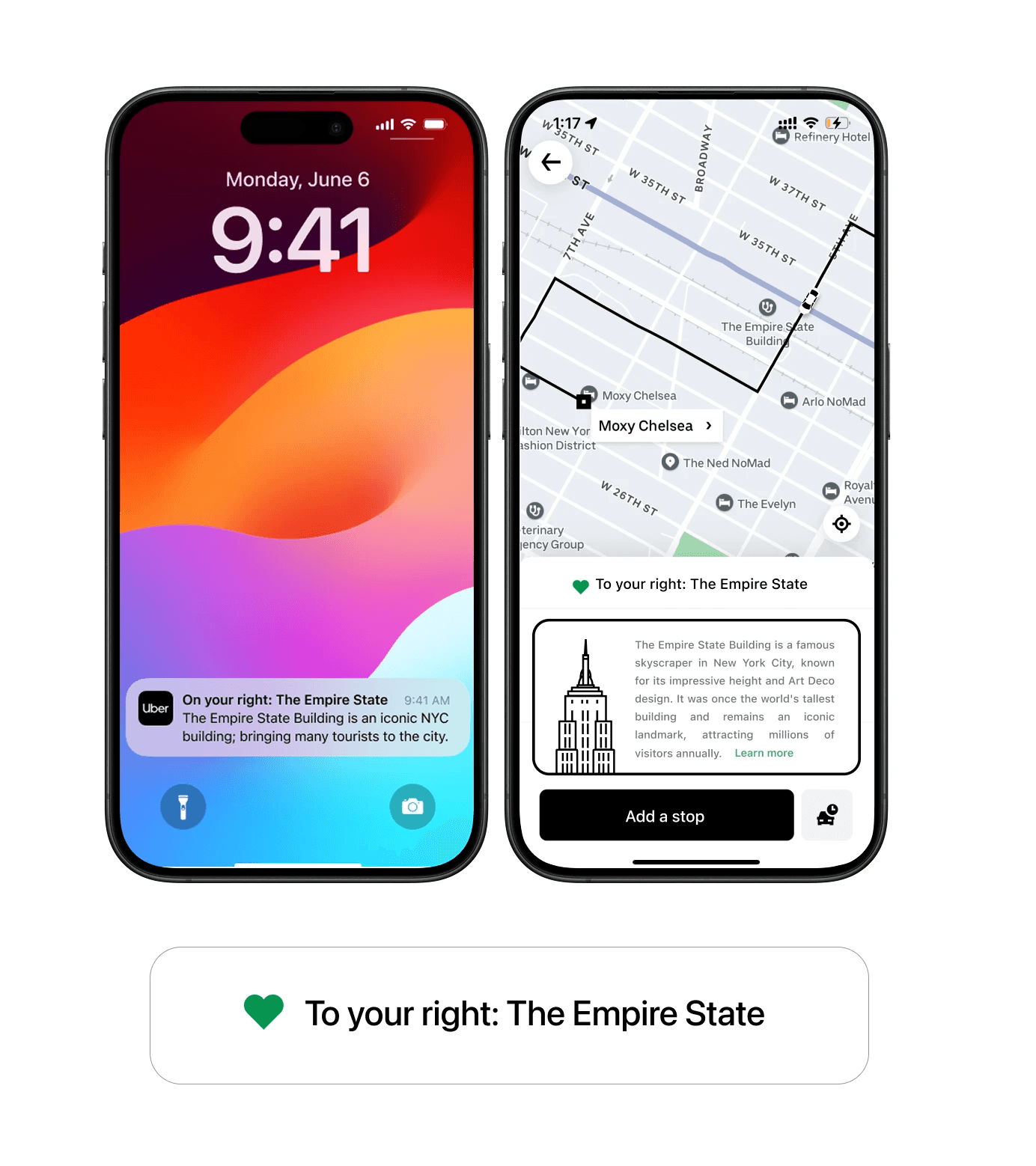 In this design, the app, as normal, displays the route to the rider's destination within Manhattan. Uber then identifies that the Empire State Building will be on the route and shows riders an option to add a stop. The rider may add it as a stop or simply pass-by and look at the famous building from their vehicle.